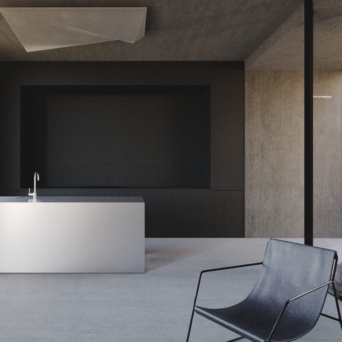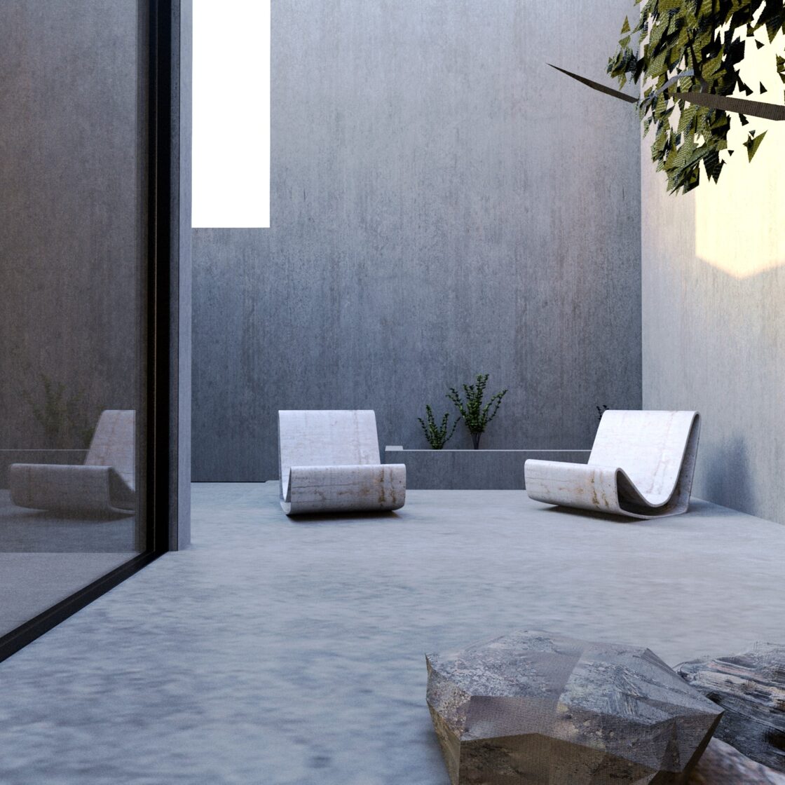 Projekt domku letniskowego w ciepłym klimacie. Wnętrze inspirowane jest motywem betonowego labiryntu, nie posiadającego żadnych drzwi oprócz wejściowych. Duże okna, puste przestrzenie i geometryczne kształty przypominają puste muzeum lub magazyn, inicjujące tworzenie sztuki.